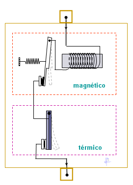 Su funcionamiento se basa en un elemento térmico, formado por una lámina bimetálica que se deforma al pasar por la misma una corriente durante cierto tiempo, para cuyas magnitudes está dimensionado (sobrecarga) y un elemento magnético, formado por una bobina cuyo núcleo atrae un elemento que abre el circuito al pasar por dicha bobina una corriente de valor definido (cortocircuito)